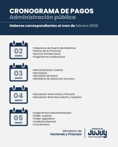 Se informa cronograma de pagos correspondiente al periodo FEBRERO para la Administración Pública de Jujuy.